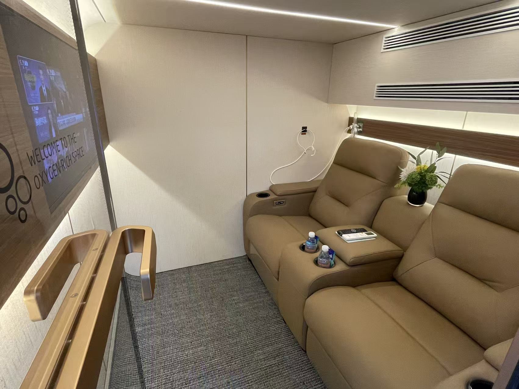 Premium hard-shell HBOT chamber for two people with 1.5 ata, 5 l/min oxygen flow, 93% ± 3% oxygen concentration, touch display, HD TV, internal/external communication, ambient light, intelligent air conditioning and two electric recliners in leather. Developed for clinics, spas, wellness centers and exclusive private environments.