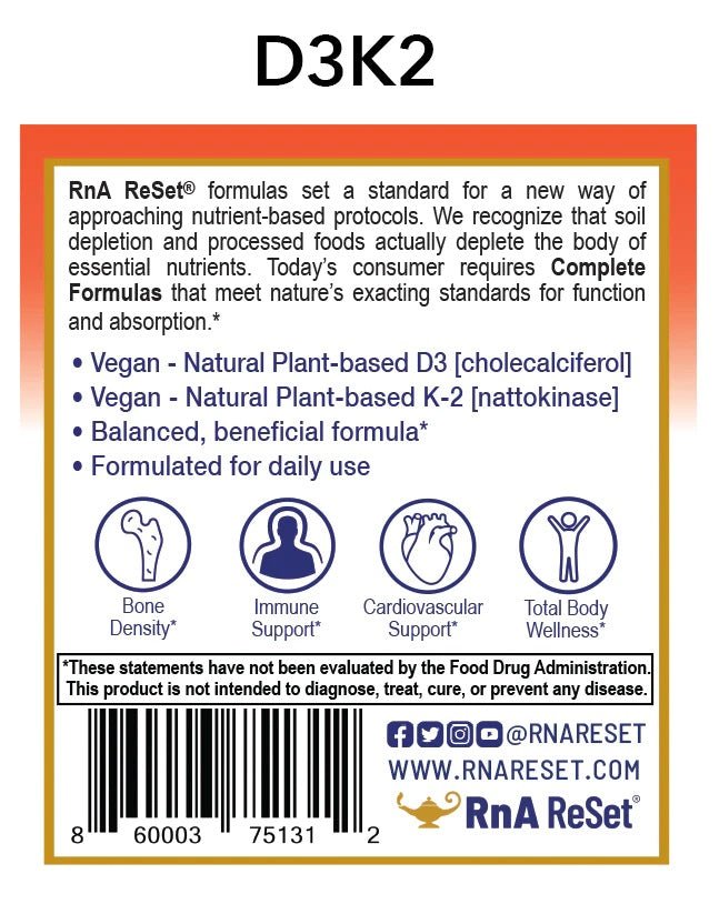 D3K2 ReSet® contains 4000 IU vitamin D3 (cholecalciferol) from plant-based lichen, 100 mcg vitamin K2 (menaquinone-7) from nattokinase, and 11 mg RnA ReSet barley powder. The capsules are made from vegetable cellulose, and the product is free of gluten, soy, lactose, artificial colours, preservatives and fillers. The bottle contains 60 capsules, corresponding to two months' use with daily dosing.
