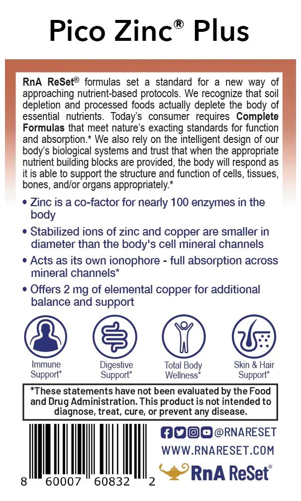 Pico Zinc Plus® is an advanced nutritional supplement designed to support the body's immune system, promote normal heart function, and improve skin and hair health. The product contains picometer-sized zinc and copper, which ensures complete absorption at the cellular level. Zinc is required for the catalytic activity of around 100 enzymes and plays an important role in the immune system, protein synthesis, wound healing, DNA synthesis and cell division. Copper, which is also included in this formula, is essential for the formation of red and white blood cells, the maintenance of skin elasticity, and hair color.