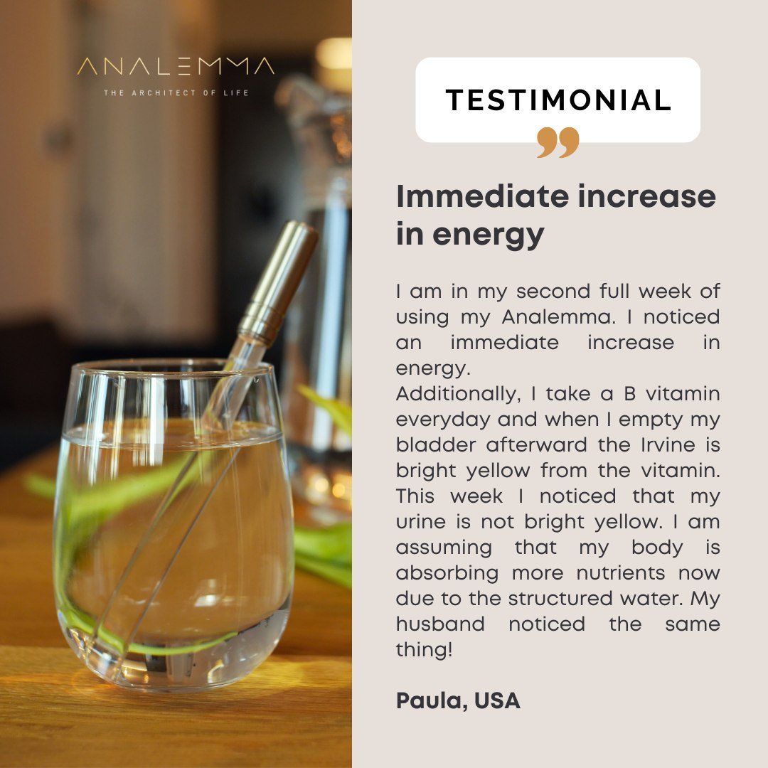 In einer doppelblinden, placebokontrollierten Studie an gesunden Erwachsenen, die zwei Monate lang täglich Aǹalemma-kohärentes Wasser tranken, wurde im Vergleich zu Placebo ein durchschnittlicher Anstieg des ATP-Spiegels im Blut um etwa 20 % festgestellt. ATP ist die „Energiewährung“ der Zellen und steht in engem Zusammenhang mit der Funktion der Mitochondrien. Viele Benutzer beschreiben, dass sich das Wasser leichter zu trinken anfühlt, dass sie ihre Wasseraufnahme auf natürliche Weise erhöhen und dass sich ihre Energie über den Tag hinweg stabiler anfühlt.