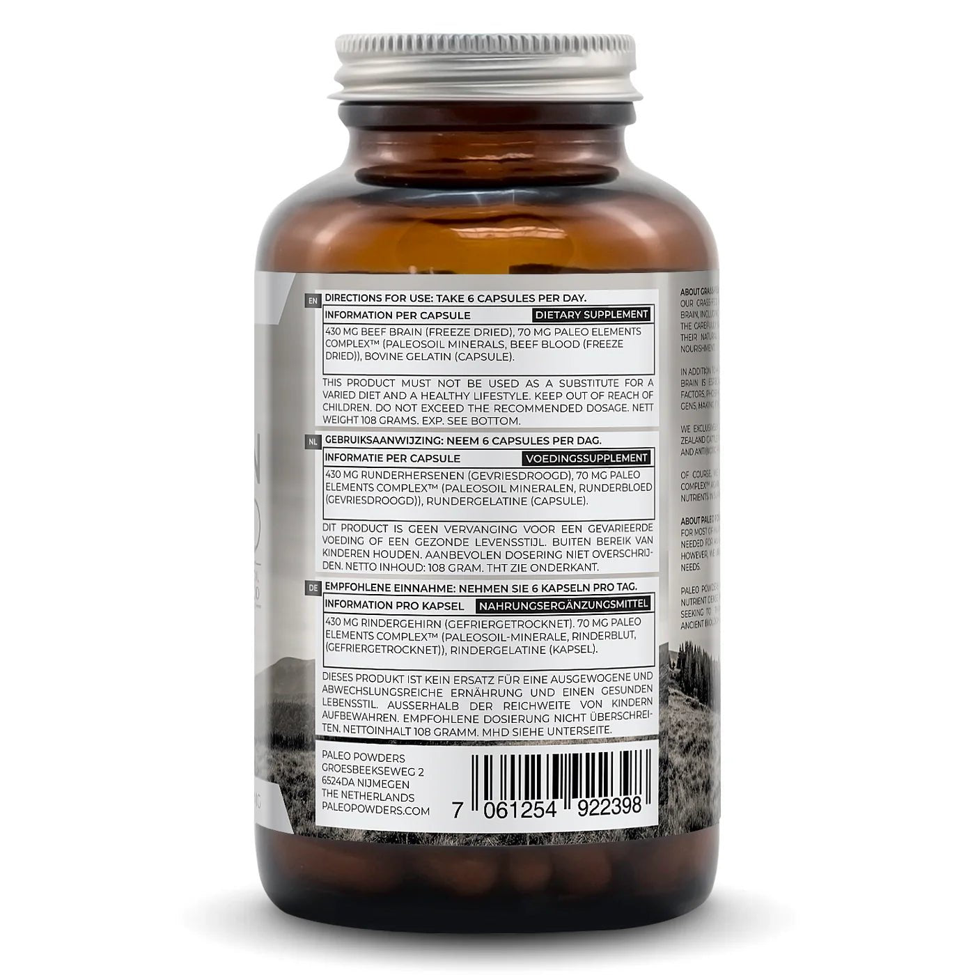 Das Produkt enthält das gesamte Gehirn, einschließlich Drüsen wie Zirbeldrüse, Hypophyse und Hypothalamus, um ein natürliches Nährstoffgleichgewicht zu gewährleisten. Paleo Elements Complex™ fügt zusätzliche Mikronährstoffe wie Hämeisen, Vitamin D3-Sulfat, K2 und Mineralien aus Paläo-Erde hinzu und macht es zu einer einzigartigen und ganzheitlichen Ergänzung.