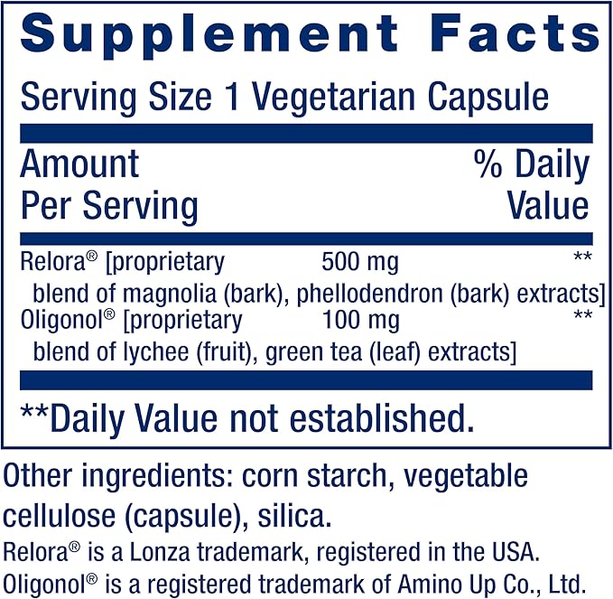 Zutaten: Relora® (Magnolienrinde, Phellodendronrinde), Oligonol® (Litschifrucht, grünes Teeblatt), Maisstärke, pflanzliche Cellulose (Kapsel), Kieselsäure.