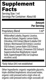 Zutaten: Wildgeerntete Lobelie (Lobelia inflata), Bio-Süßholz (Glycyrrhiza glabra), Wildgeernteter Wermut (Artemisia absinthium), Zimtkassia (Cinnamomum cassia), Mucuna-Extrakt (Mucuna pruriens), Bio-Zitronenmelisse (Melissa officinalis), Kurkuma-CO₂-Extrakt (Curcuma longa)