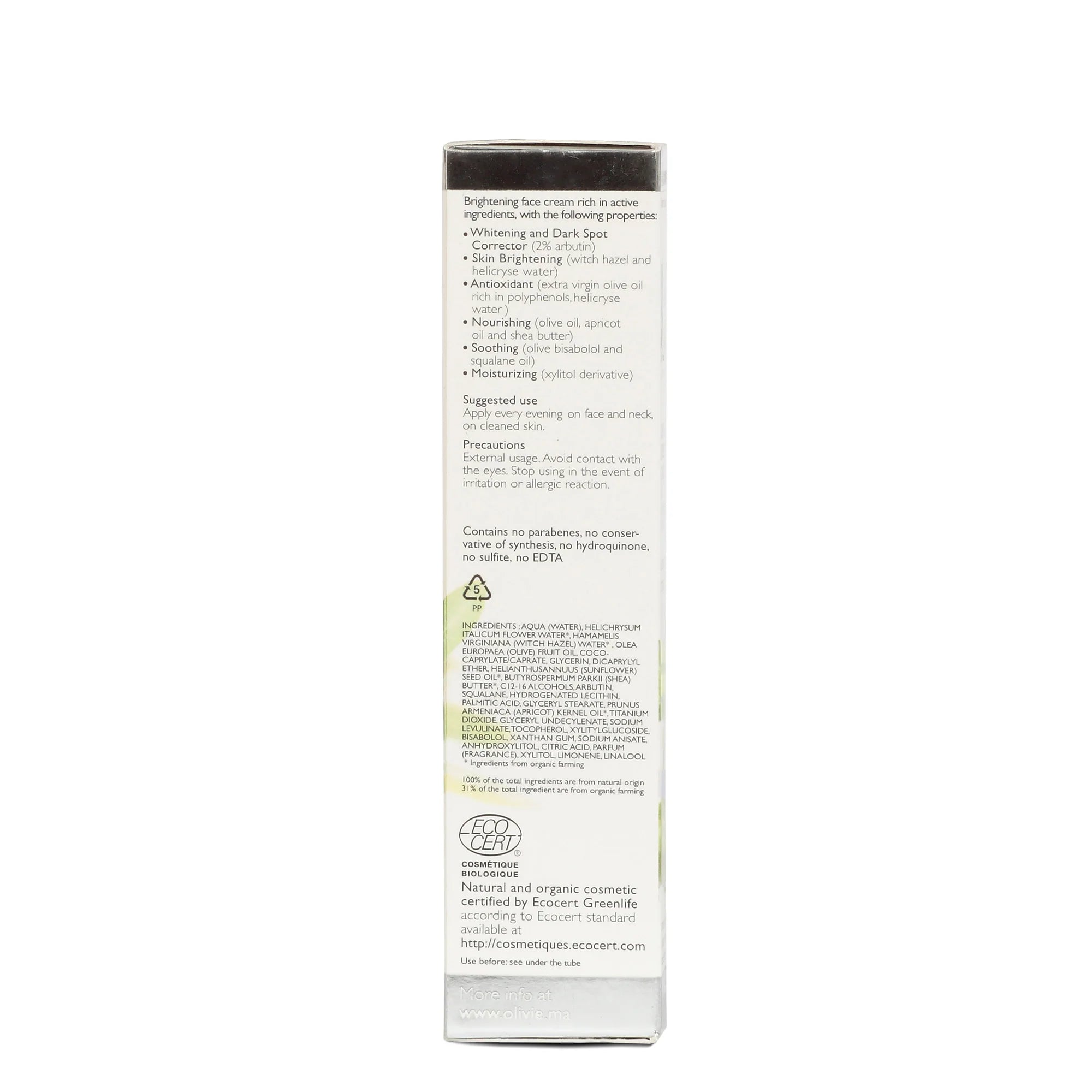 Entdecken Sie die ultimative Luxuscreme, die Ihre Haut in nur wenigen Wochen sichtbar glatter, klarer und strahlender machen kann. OLIVIE BEAUTY ist eine 100 % natürliche und Ecocert-zertifizierte Bio-Gesichtscreme, die in Frankreich entwickelt wurde und eine einzigartige Kombination aus Wüstenoliven-Polyphenolen (insbesondere Hydroxytyrosol), 2 % Arbutin und beruhigenden Pflanzenwässern aus Helichrysum und Hamamelis enthält. Diese luftlose 40-ml-Tubencreme ist frei von Parabenen, synthetischen Konservierungsmitteln, Hydrochinon, Sulfiten und EDTA – und liefert Ergebnisse, die Sie sowohl sehen als auch fühlen können: Glanz, einen glatteren Teint und eine weichere Haut.