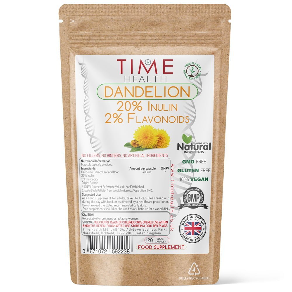 El diente de león (Taraxacum officinale) se ha utilizado durante cientos de años en la medicina herbaria tradicional para favorecer la salud digestiva y del hígado. Este suplemento dietético avanzado combina raíz y hoja en un extracto de espectro completo enriquecido con fibras prebióticas naturales (inulina) y flavonoides. El producto es 100% vegano y se fabrica en el Reino Unido según los estándares GMP.