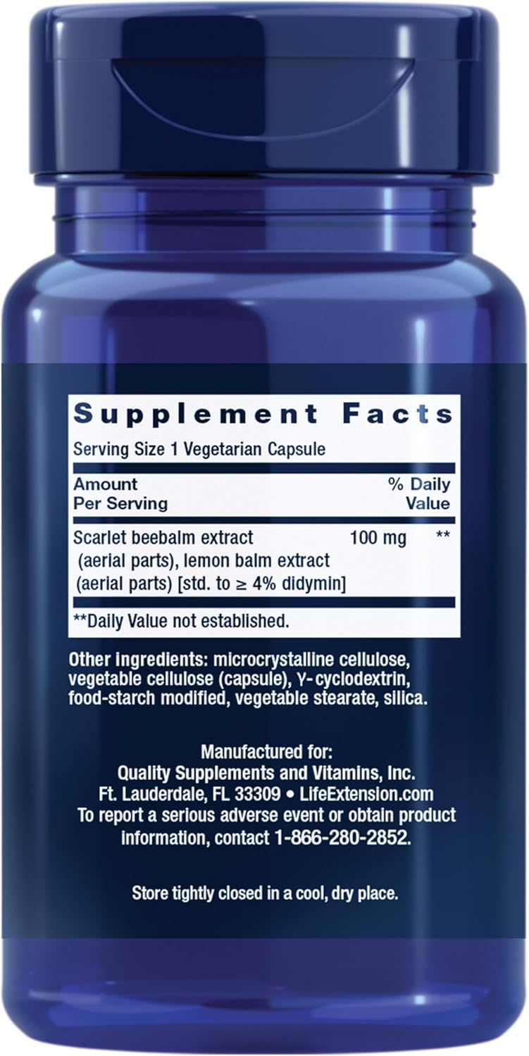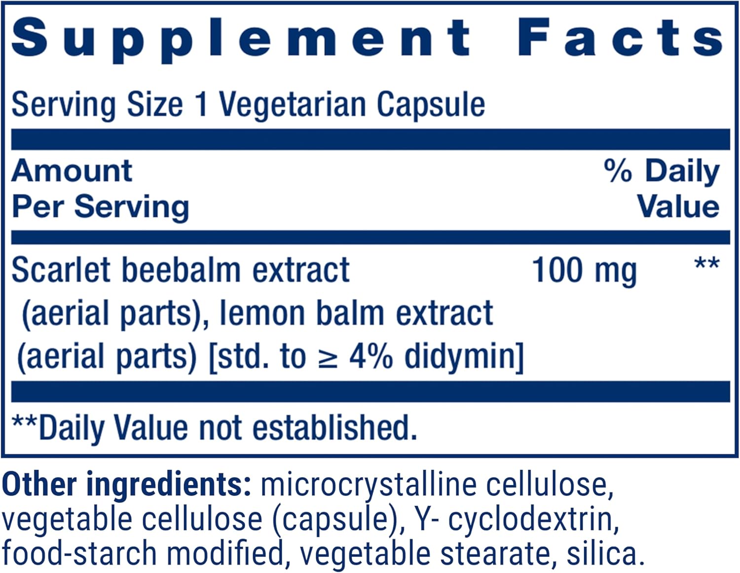 Extracto de melisa escarlata (Monarda didyma), extracto de melisa (Melissa officinalis) [estandarizado a ≥4% didymina], celulosa microcristalina, celulosa vegetal (cápsula), γ-ciclodextrina, almidón modificado, estearato vegetal, sílice. No se conocen alérgenos.
