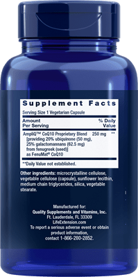 AmpliQ CoQ10™ 100 mg es un suplemento dietético vegetariano de Life Extension. Cada cápsula contiene una mezcla patentada AmpliQ™ CoQ10 de 500 mg. Esta mezcla aporta 100 mg de ubiquinona, es decir, coenzima Q10, y 125 mg de galactomananos procedentes de semillas de fenogreco como FenuMat® CoQ10.