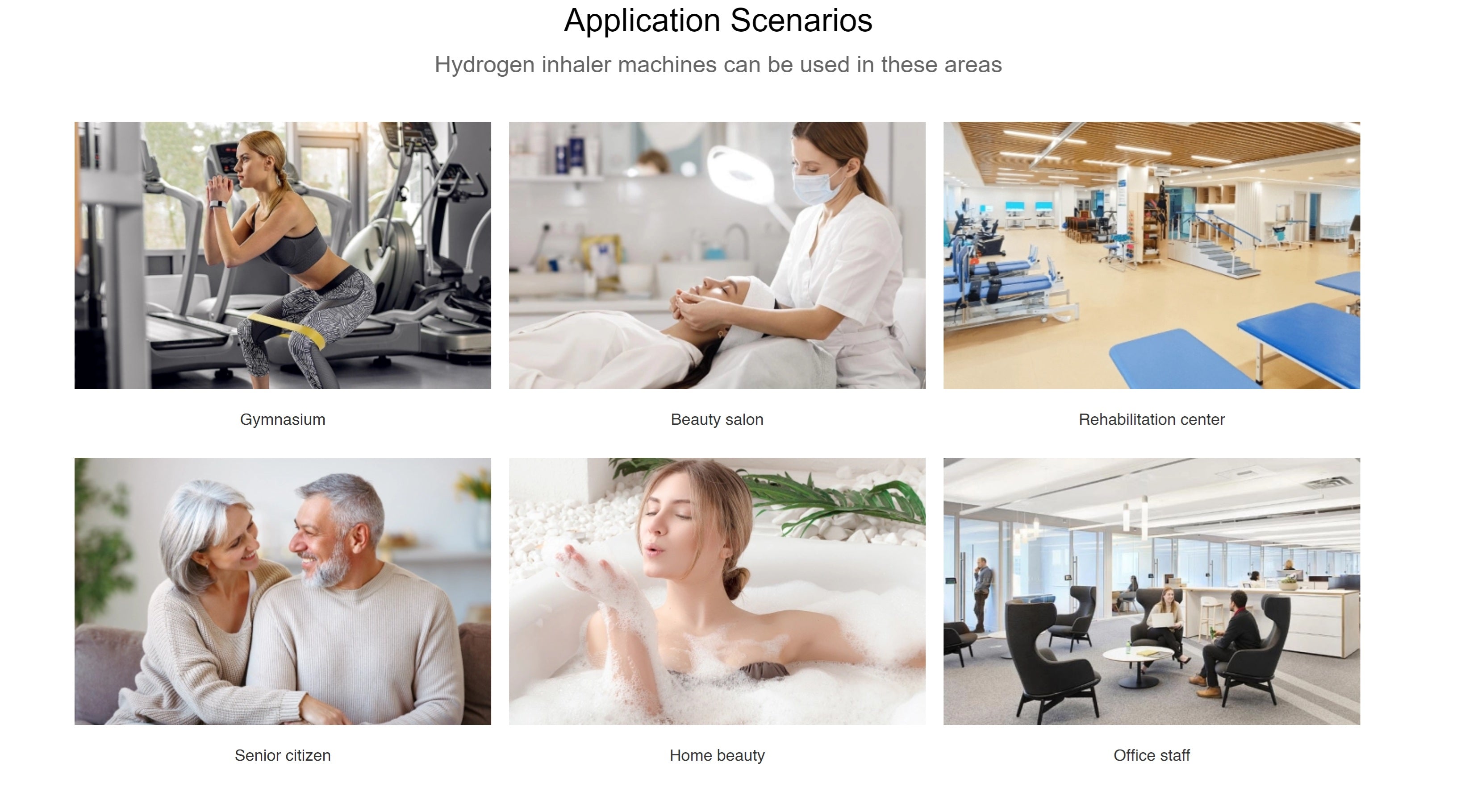 El inhalador de hidrógeno GY-H6000 se utiliza hoy en día en numerosos entornos y contextos, incluido el uso doméstico, entornos deportivos y de entrenamiento, centros de rehabilitación, fisioterapia, salones de belleza y bienestar, entornos de oficina y entre las personas mayores que desean un sistema suave y fácil de usar para el bienestar diario.