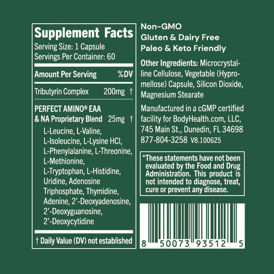 Tributirina con PerfectAmino® es un suplemento dietético posbiótico avanzado desarrollado para fortalecer la función de la barrera intestinal, respaldar un microbioma equilibrado y optimizar la absorción de nutrientes por parte del cuerpo. La tributirina actúa como una fuente estable y específica de butirato, un ácido graso de cadena corta que el cuerpo produce de forma natural, pero que a menudo se reduce debido al estilo de vida moderno, el estrés, el uso de antibióticos o un desequilibrio en la flora intestinal. Cuando las células intestinales obtienen suficiente butirato, la barrera intestinal se fortalece, el sistema inmunológico se equilibra y la digestión funciona de manera más armoniosa. PerfectAmino® se incluye para proporcionar aminoácidos esenciales y componentes básicos de ácidos nucleicos que contribuyen a la regeneración, reparación y eficiencia metabólica de las células. Juntos, proporcionan una combinación poderosa para el apoyo holístico del intestino, el sistema inmunológico, la piel y la claridad cognitiva.