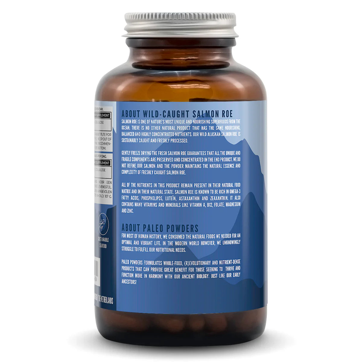 Ingrédients : œufs de saumon sauvage lyophilisés, capsule (gélatine de poisson). Aucun additif. Sans OGM. Fabriqué aux Pays-Bas. Sans gluten, soja, lait, blé et additifs artificiels.