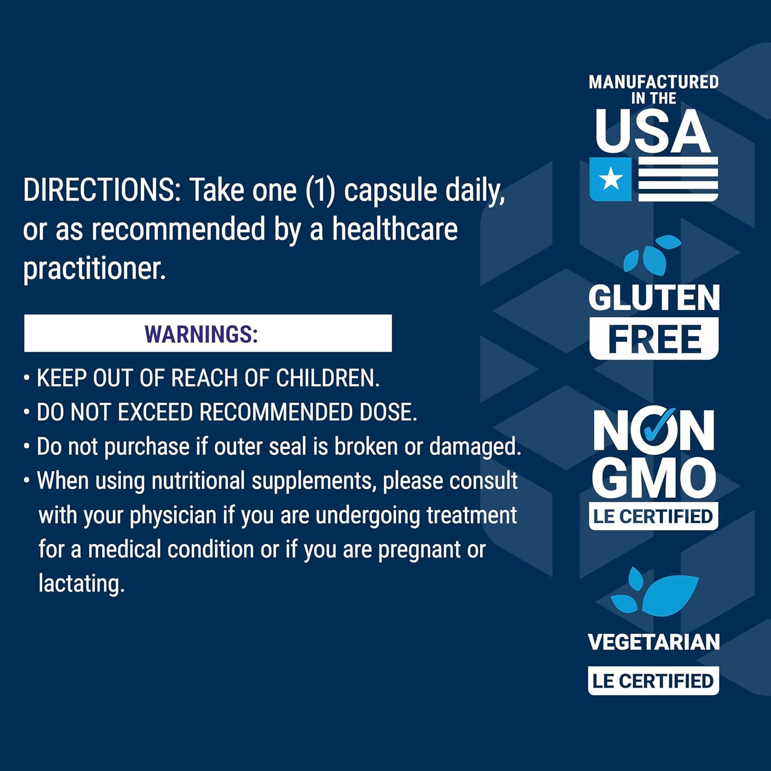 Autorisé à être utilisé par des adultes. Toute utilisation de suppléments est à vos propres risques et doit être effectuée en consultation avec un médecin. La dose journalière recommandée ne doit pas être dépassée. L'effet de ce produit peut varier d'une personne à l'autre. Les compléments alimentaires ne doivent pas remplacer une alimentation variée. Les femmes enceintes et allaitantes doivent consulter un médecin avant utilisation. Tenir hors de portée des enfants.