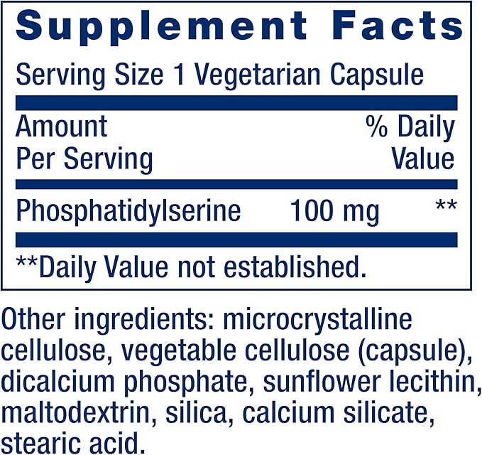 • Contenu par dose quotidienne : Phosphatidylsérine 100 mg (pas de valeur RI établie)