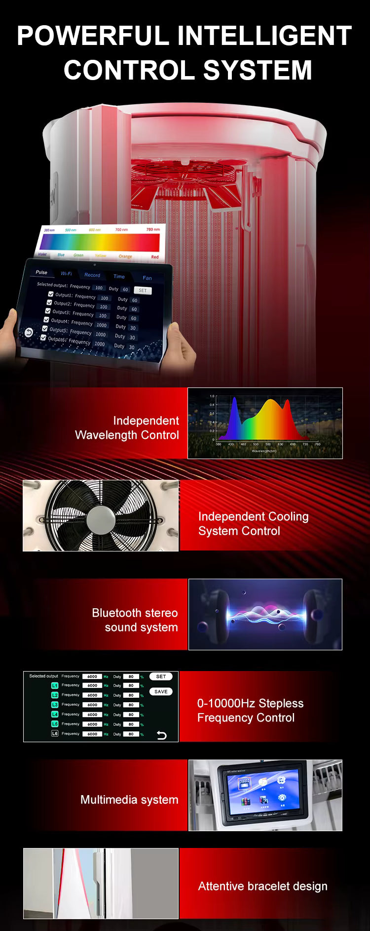 L'Uno Vita Merican M11 Plus est le modèle haut de gamme de la série Merican Plus et représente la plus haute capacité de photobiomodulation verticale du corps entier. Le système a été développé pour les environnements professionnels qui nécessitent une densité de LED maximale, une puissance totale élevée, un temps de traitement rapide et un fonctionnement stable lors d'une utilisation continue. La construction verticale de la capsule à 360° assure une répartition uniforme de la lumière sur tout le corps et rend l'unité particulièrement adaptée aux gymnases, clubs sportifs, centres de rééducation, spas haut de gamme et cliniques à haut débit.