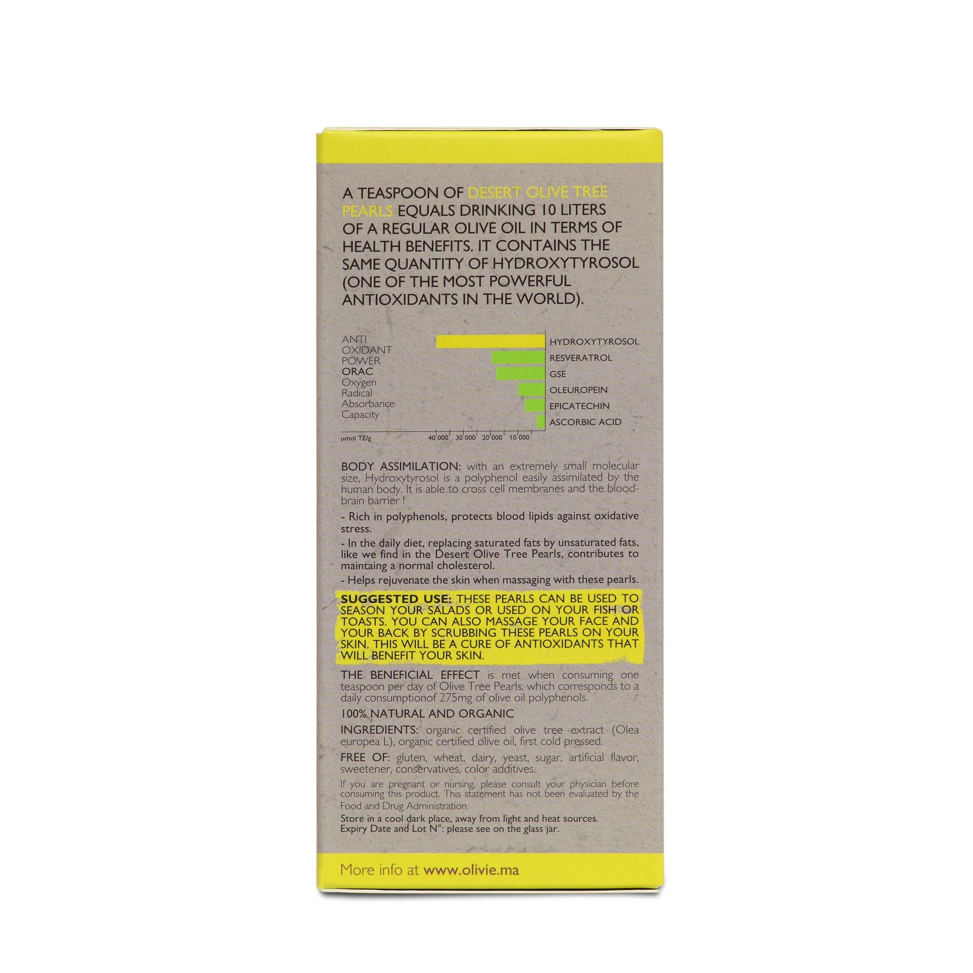 Desert olive pearls (pressed pulp of olive leaves, young olive leaves, olive fruit) and extra virgin olive oil from desert olive trees. No other ingredients are added.