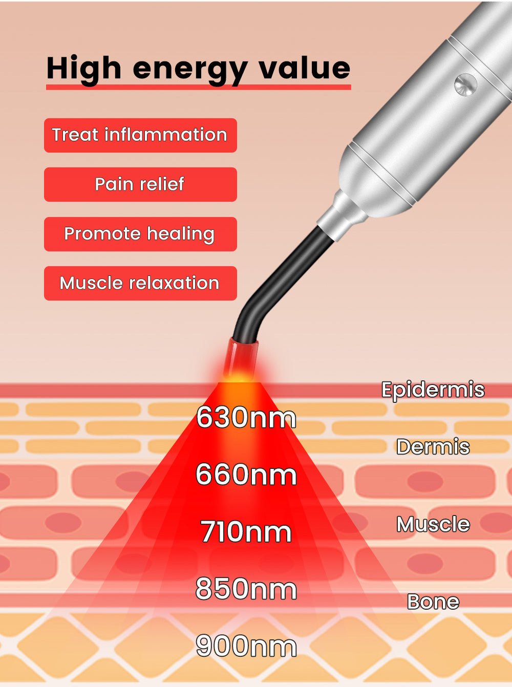 - 900 nm (Near-infrared light): Provides significant therapeutic benefits by reaching the deepest layers of tissue, improving cellular energy, reducing inflammation and accelerating the healing process of injuries and wounds.