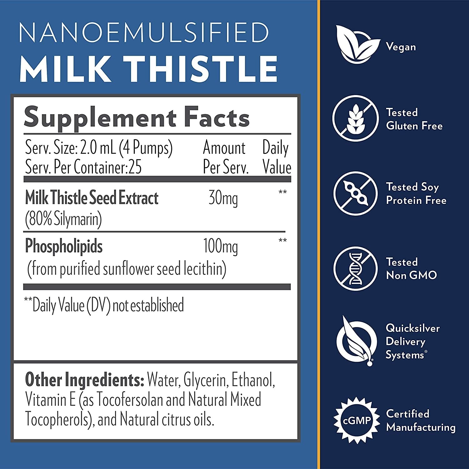 Nanoemulsified Milk Thistle är ett avancerat kosttillskott utvecklat med Quicksilver Scientifics patenterade liposomala teknologi (QDS®), som säkerställer snabb absorption och hög biotillgänglighet. Den aktiva substansen i mjölktistel, silymarin, har traditionellt sett haft låg biotillgänglighet i vanliga kapsel- och tablettformer. Med nanoemulsionsteknologi levereras silymarin i små, stabila liposomer (20–100 nm) som absorberas direkt i munhålan och matsmältningssystemet. Detta ger snabbt och effektivt stöd för levern, avgiftning och matsmältning.