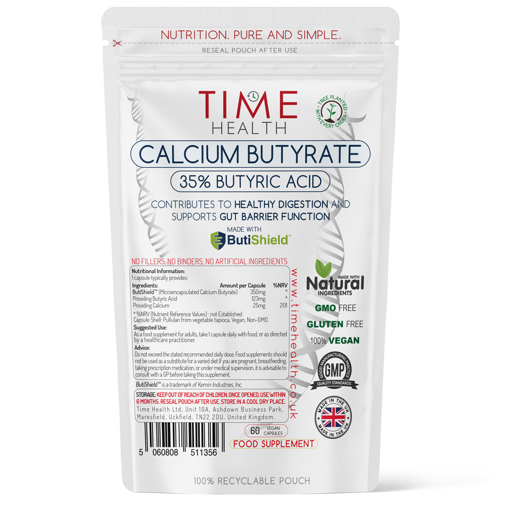 Kalciumbutyrat med ButiShield™ är ett högkvalitativt kosttillskott designat för att stödja tarmhälsa och mikrobiombalans. Varje kapsel innehåller 350 mg mikroinkapslat kalciumbutyrat, vilket ger minst 123 mg smörsyra, en kortkedjig fettsyra som fungerar som en primär energikälla för tarmceller. Med patenterad MicroPEARLS™-teknologi säkerställs långsam frisättning av den aktiva ingrediensen för ökad biotillgänglighet och skonsam absorption. Produkten är vegansk, fri från fyllmedel och tillsatser, och producerad i Storbritannien enligt strikta GMP-standarder. Förpackningen är 100% återvinningsbar och för varje beställning planteras ett träd genom samarbete med Ecology. Kalciumbutyrat är designat för att stödja en hälsosam tarmbarriär, en balanserad mikrobiom och allmän mag-tarmhälsa, och bör användas som ett komplement till en varierad kost.