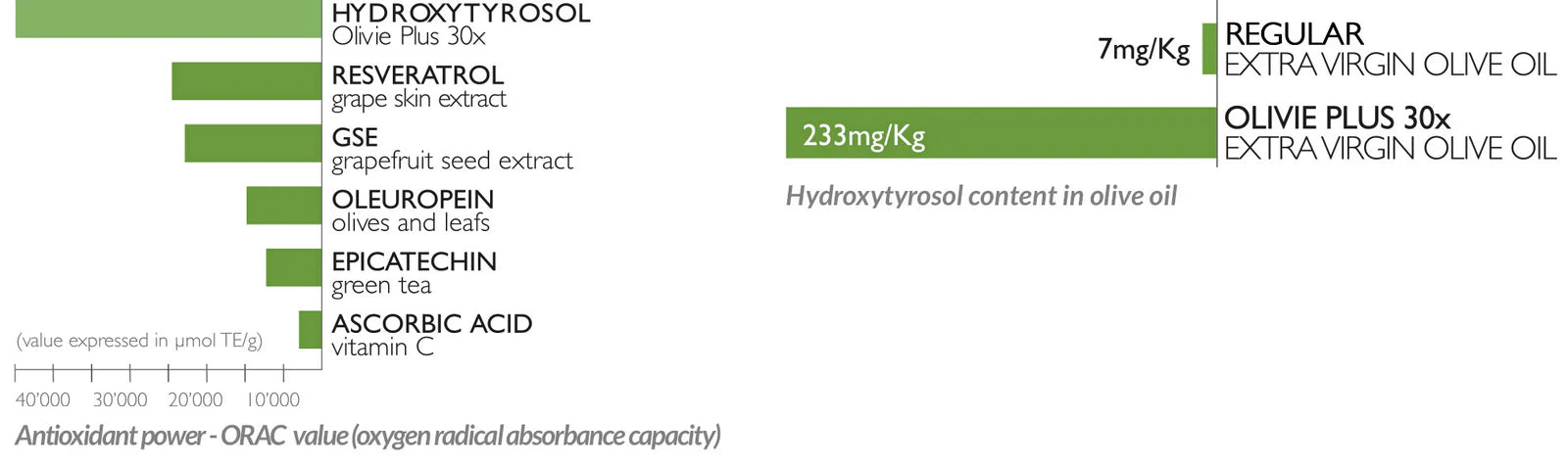 • Ca. 233 mg/kg hydroxityrosol – cirka 30 gånger mer än den genomsnittliga extra jungfruoljan